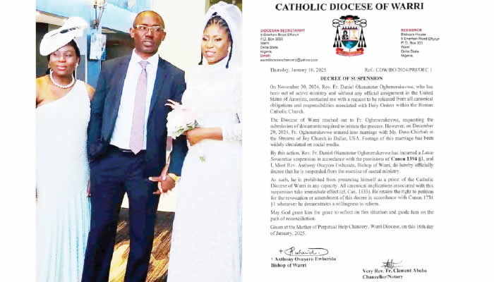 This was contained in a statement titled ‘Decree of Suspension,’ copies of which were made available to journalists in Warri. The statement, jointly signed by the Bishop of Warri, Rt. Rev. Anthony Ovayero Ewherido, and the Chancellor/Notary, Very Rev. Fr. Clement Abobo, alleged that “Fr. Oghenerukevwe entered into marriage with Ms. Dora Chichah on December 29, 2024, at the Streams of Joy Church in Dallas, USA.”